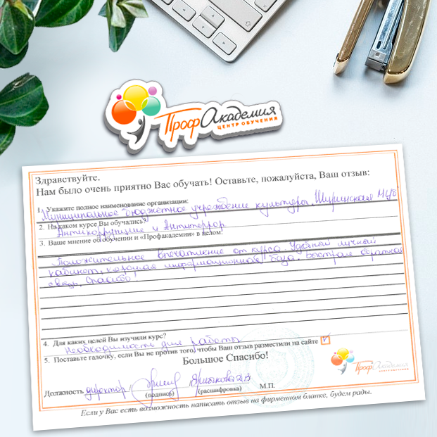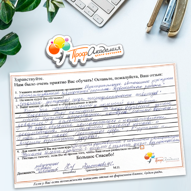 Обучение в "Профакадемия" стало для нас одним из важнейших этапов в нашей библиотечной жизни и всего Учреждения в целом. Высокая квалификация преподавателей и база знаний помогают нам сегодня в работе. Ваши педагоги компетентные, доброжелательные, грамотные и знающие свое дело. Те знания, которые вы нам даете, действительно, очень помогают в работе. Хотим выразить огромную благодарность всему вашему коллективу за внимание, знания, прекрасное отношение. Желаем ООО "Профакадемия" дальнейшего процветания и дальнейшего сотрудничества!