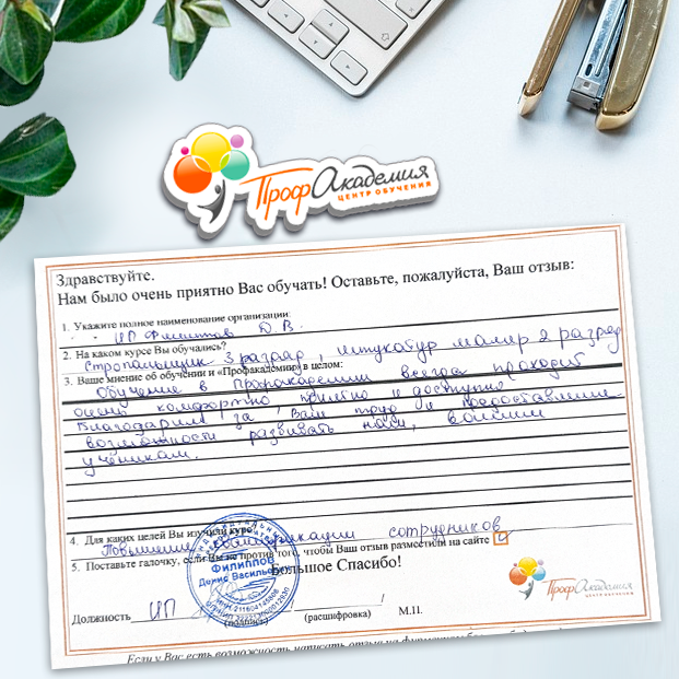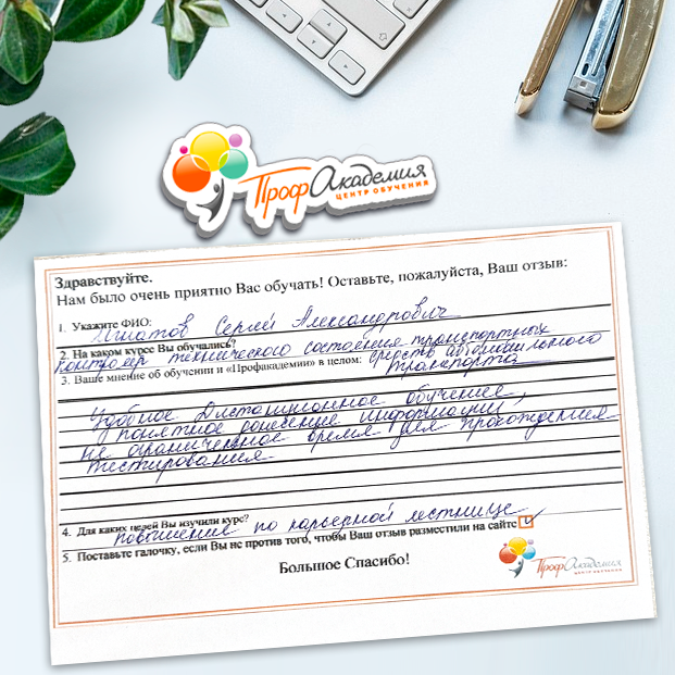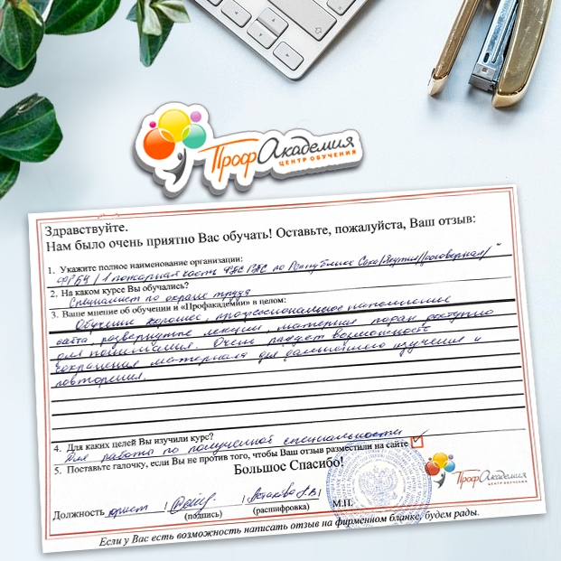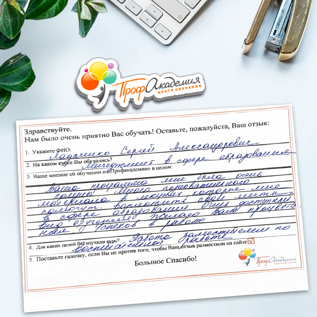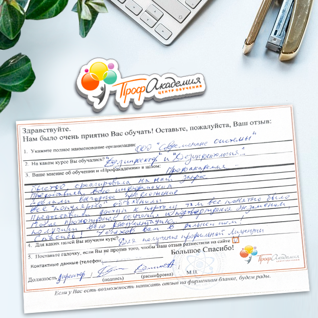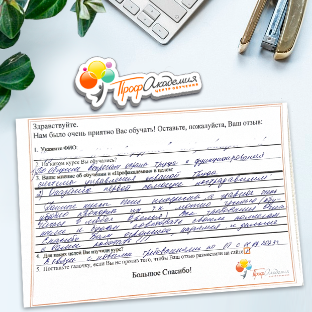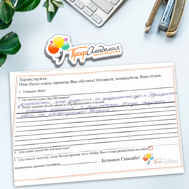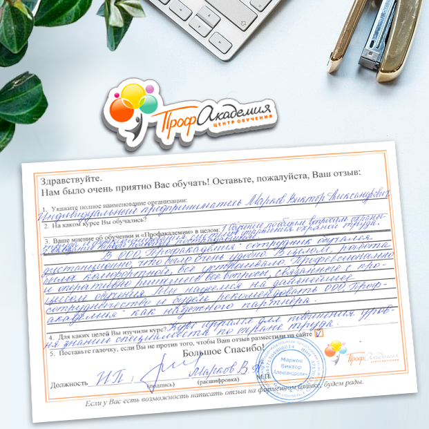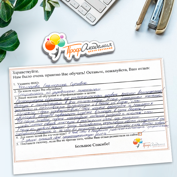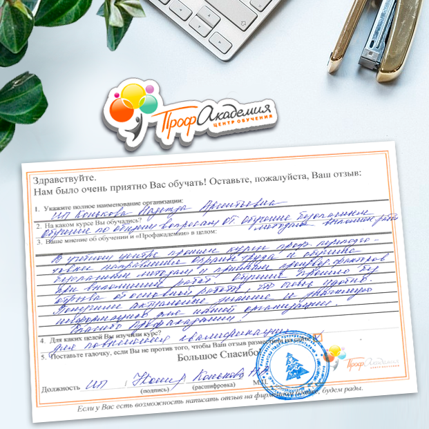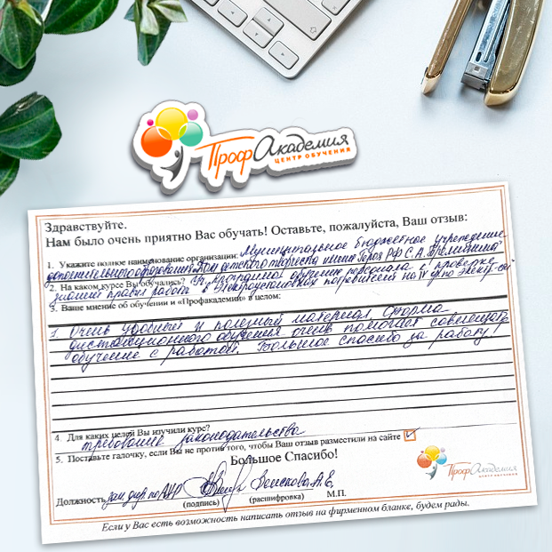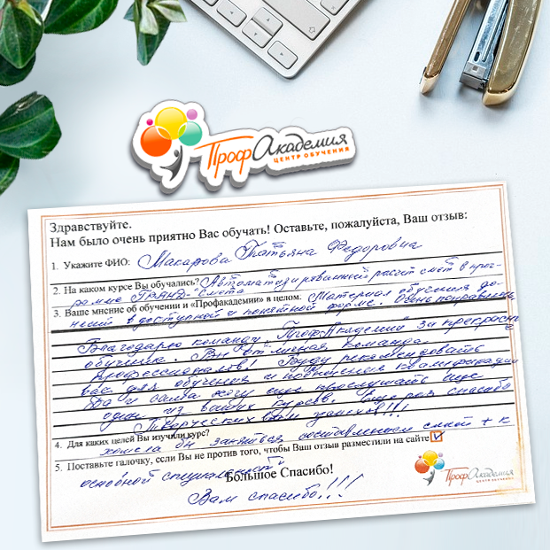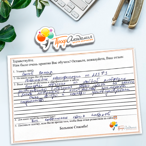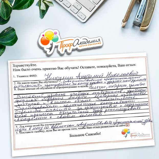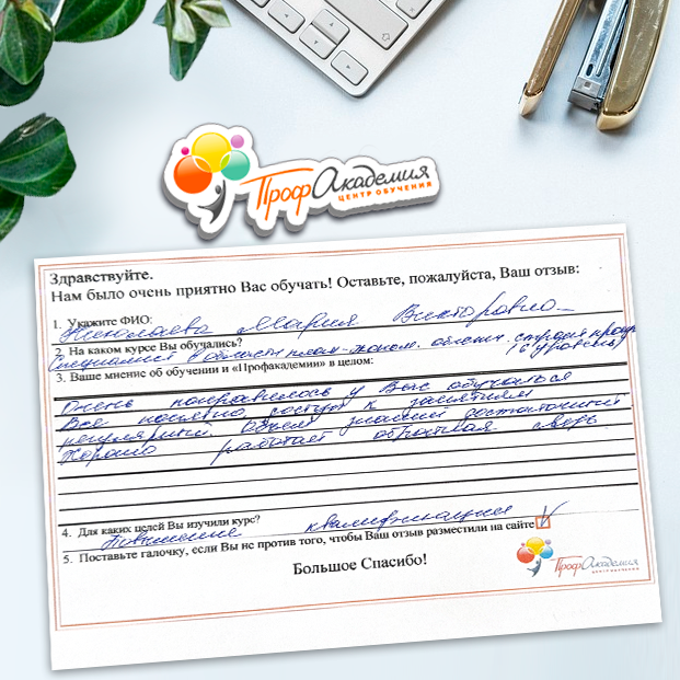 Огромное спасибо за отличный учебный материал и за учебный процесс. Обучаемся не в первый раз и остаемся по максимуму довольный всем. Профакадемия хорошая, самое главное, что учиться можно в удобное для себя время, не прерывая свою трудовую деятельность. Надеемся на дальнейшее сотрудничество.