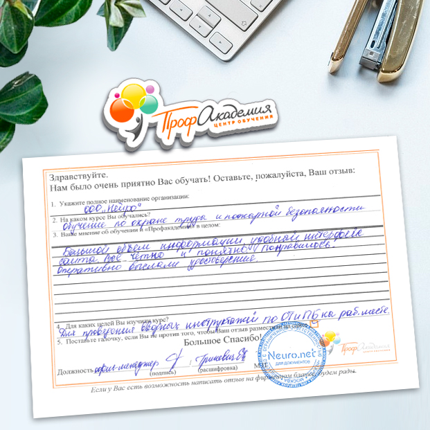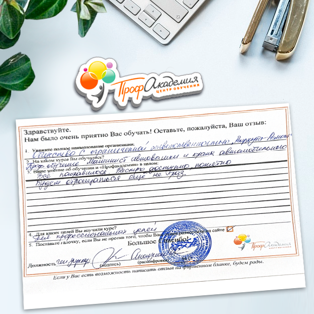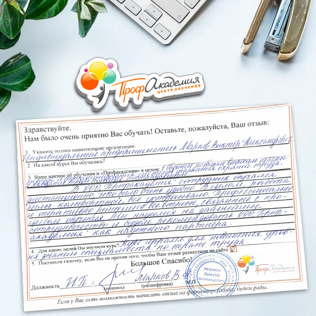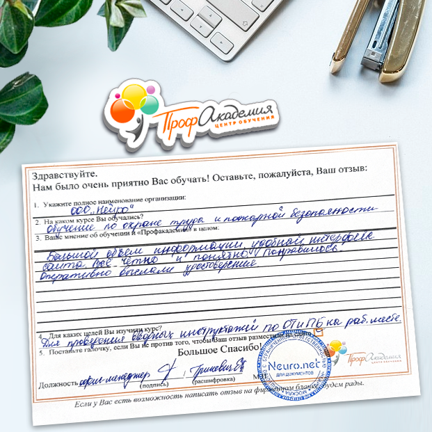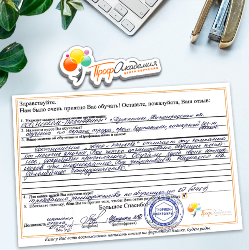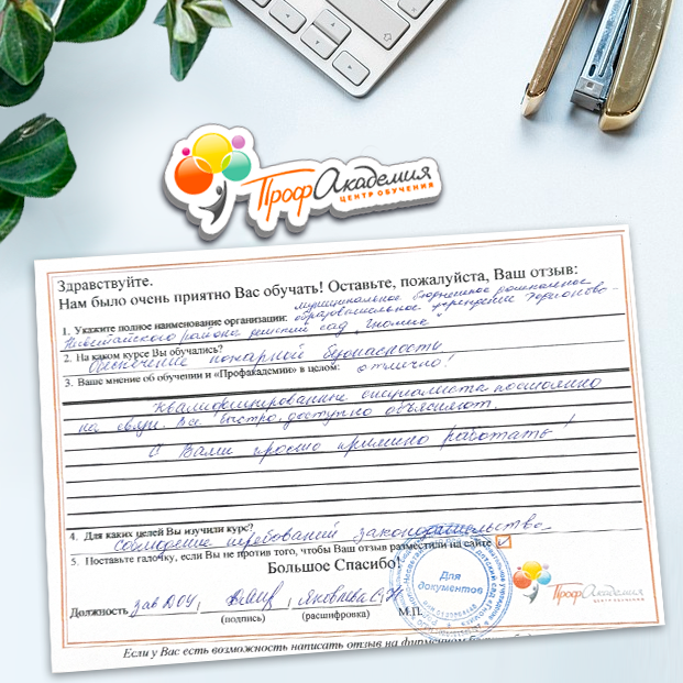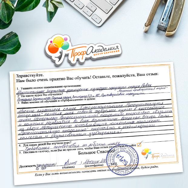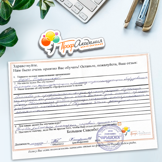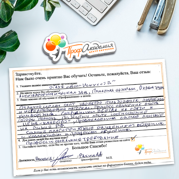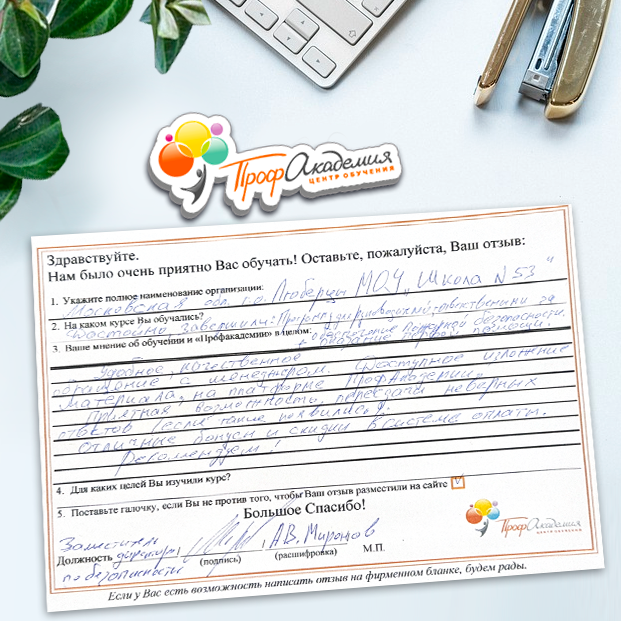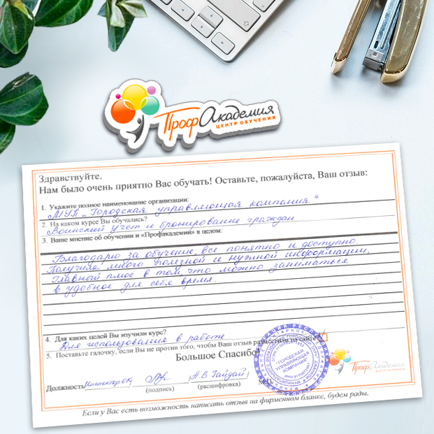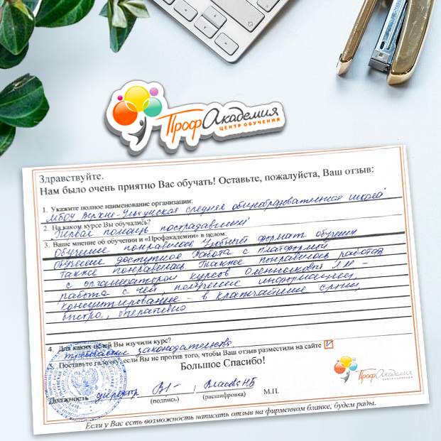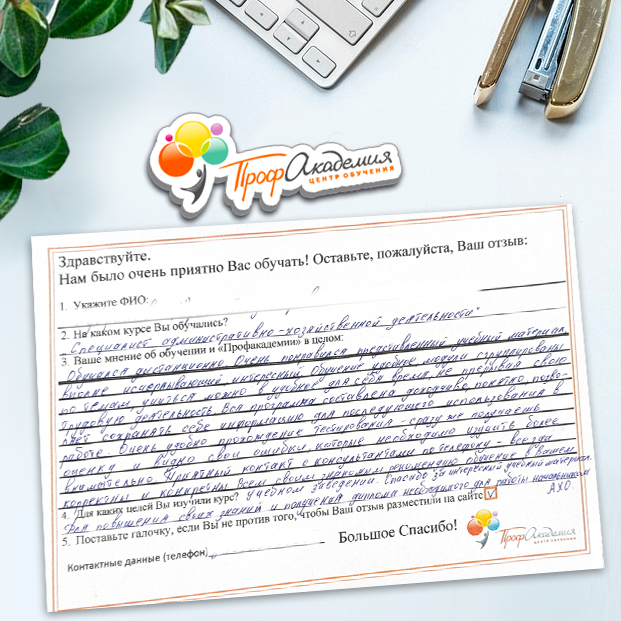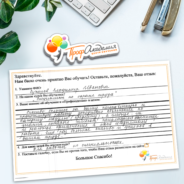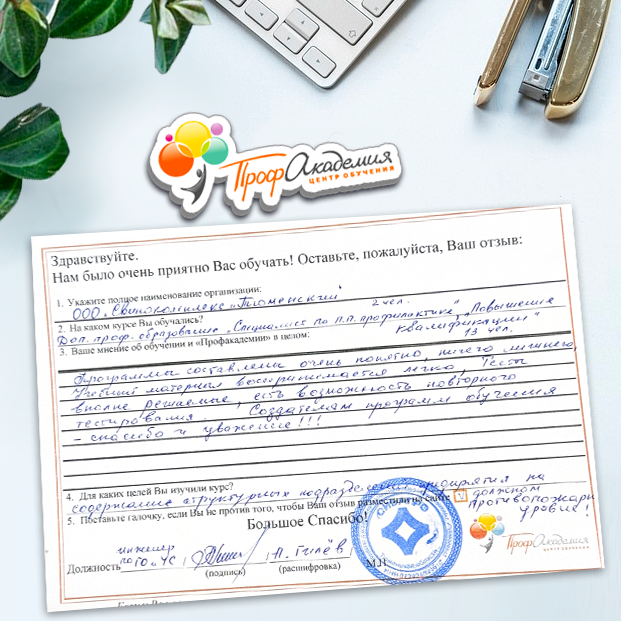 Огромное спасибо за отличный учебный материал и за учебный процесс. Обучаемся не в первый раз и остаемся по максимуму довольный всем. Профакадемия хорошая, самое главное, что учиться можно в удобное для себя время, не прерывая свою трудовую деятельность. Надеемся на дальнейшее сотрудничество.