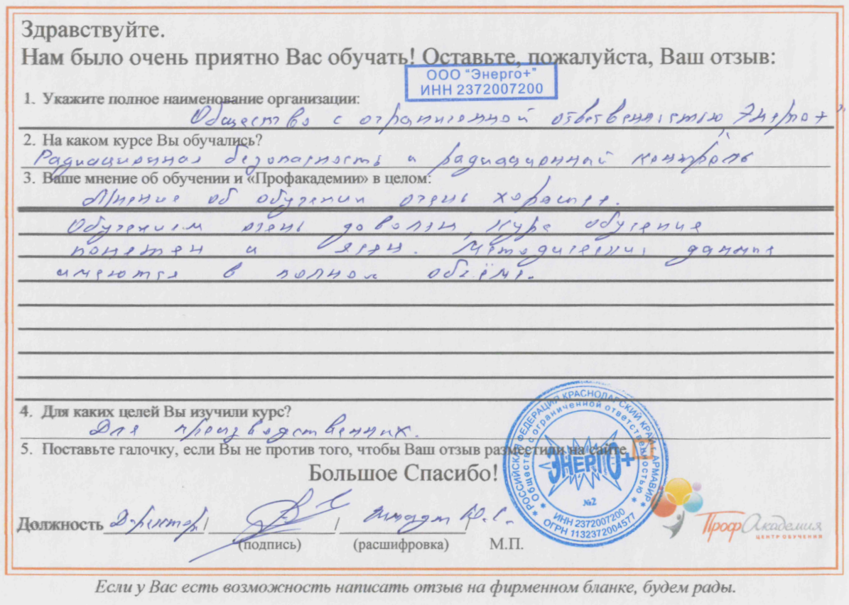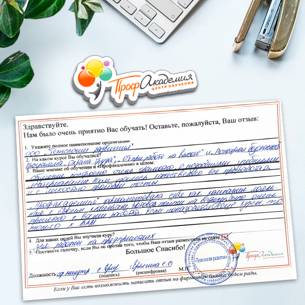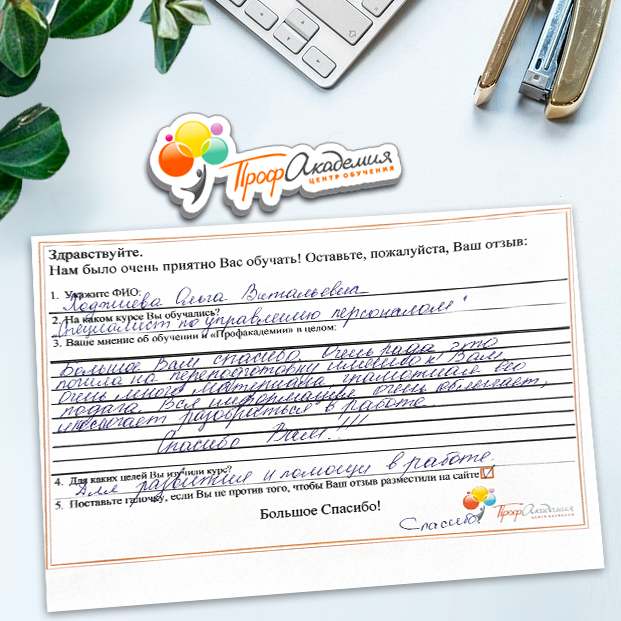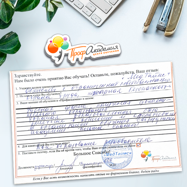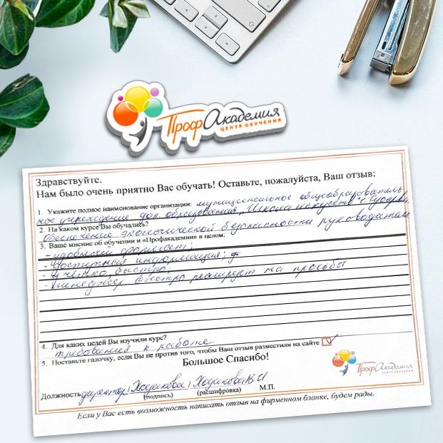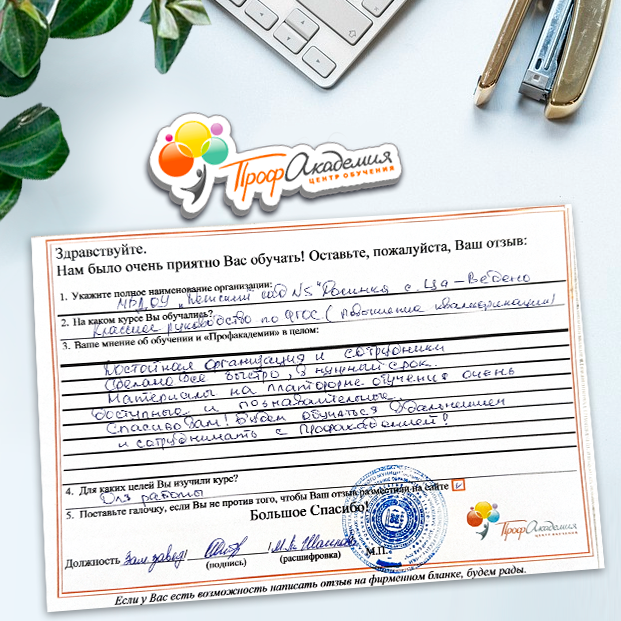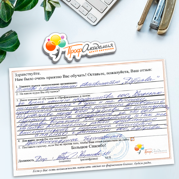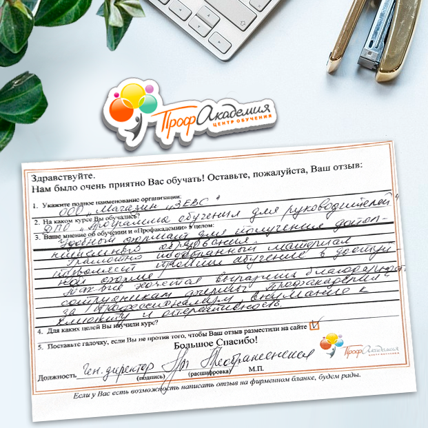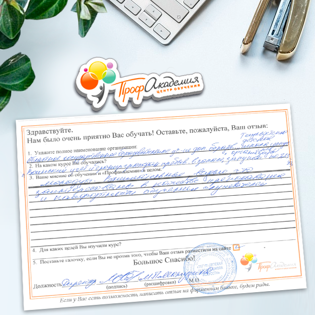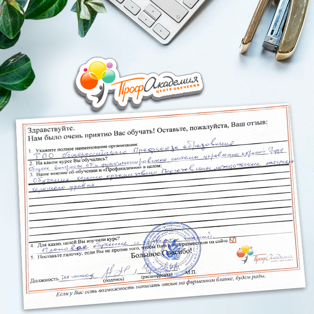 Для прохождения дополнительного профессионального образования для руководителя обращаемся в Профакадемию почти 10 лет. Хотим отметить высокий профессионализм сотрудников, доброжелательность и надежность. Команда работает качественно, без задержек и накладок. Спасибо за ваш труд! Успехов и процветания!