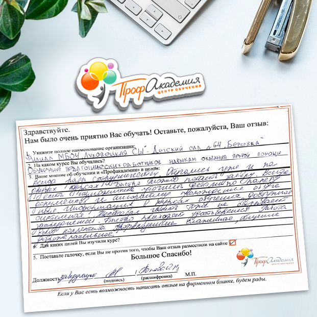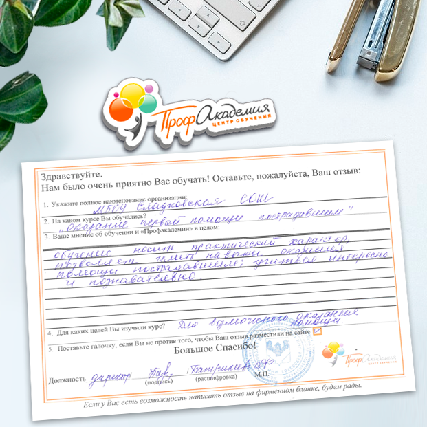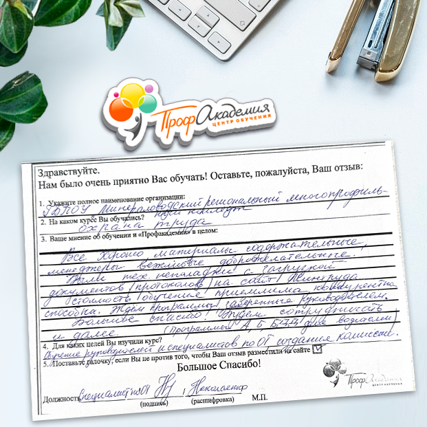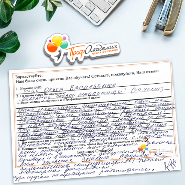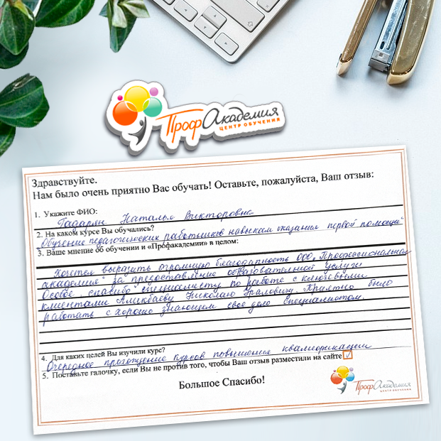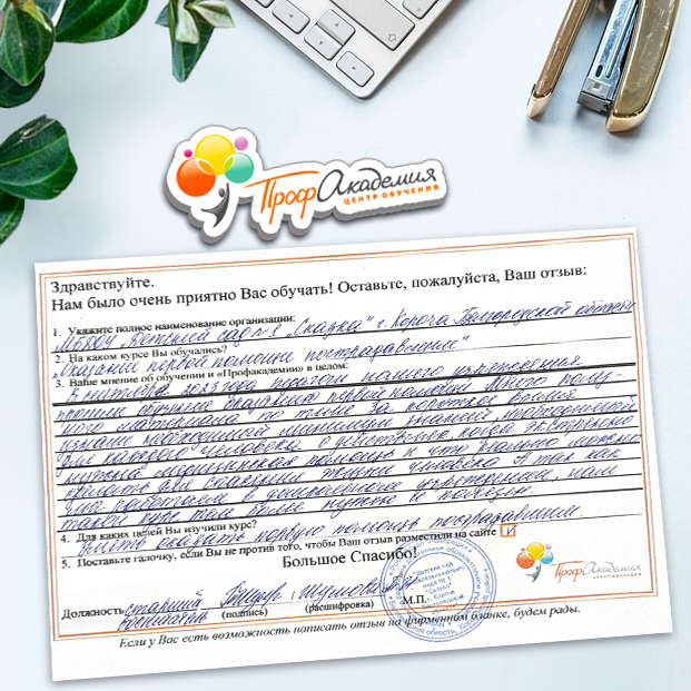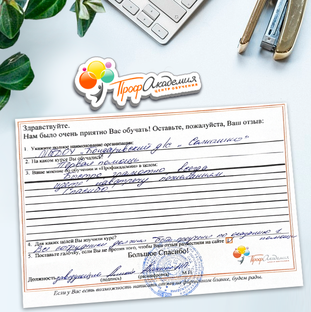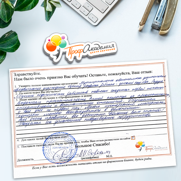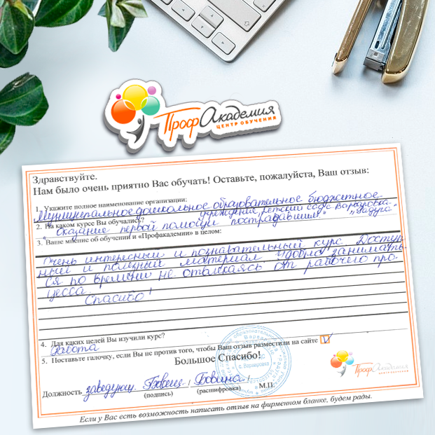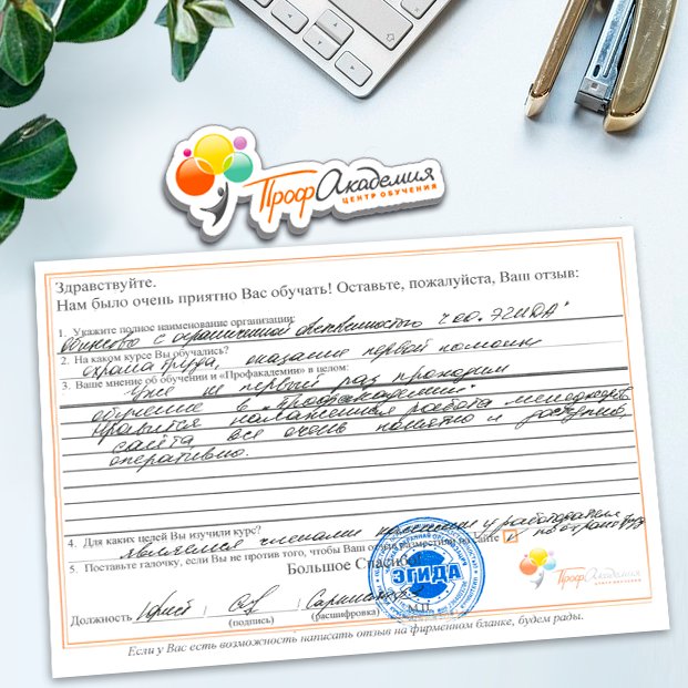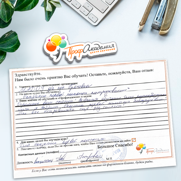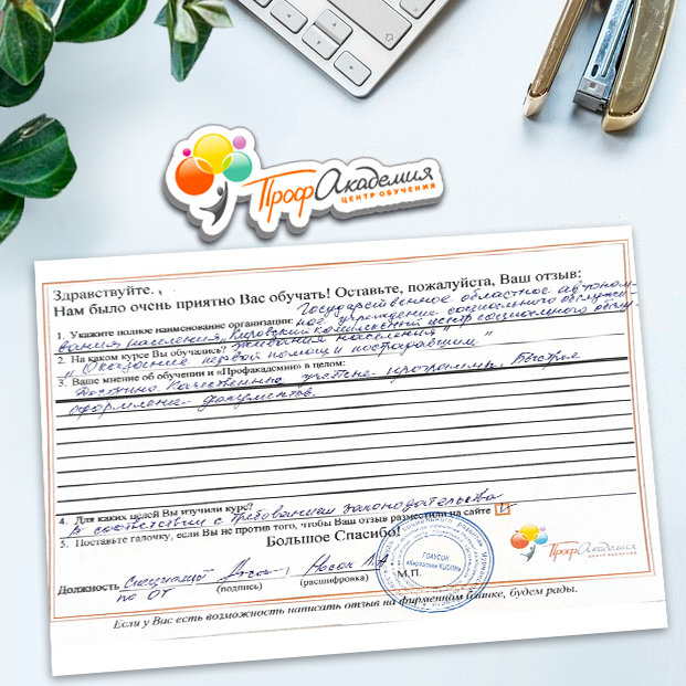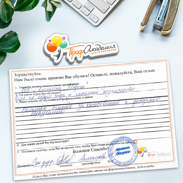 Хотим выразить благодарность образовательной организации ООО "Профакадемия" за быструю и оперативную организацию обучения для работников ОГАУЗ "МСЧ "Строитель" качественную работу, быстрое оформление всей необходимой документацией, индивидуальный подход, оперативное решение всех вопросов. Плодотворное сотрудничество.