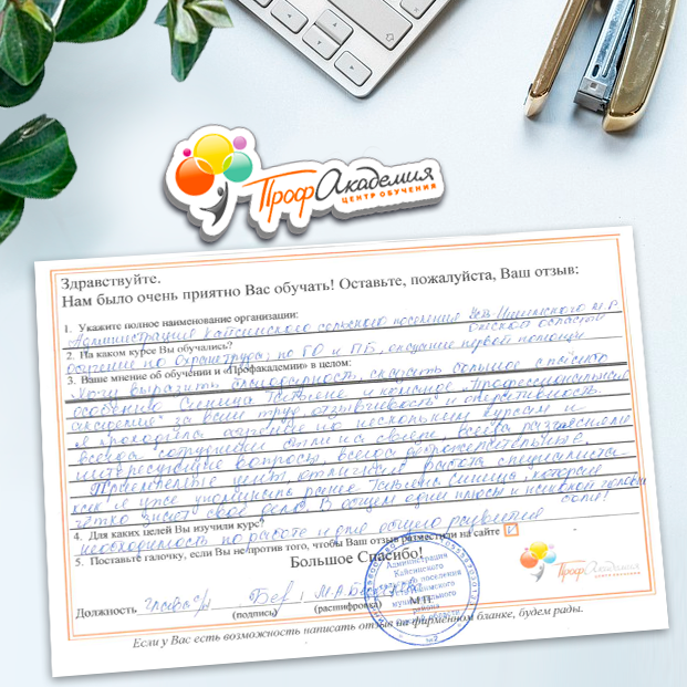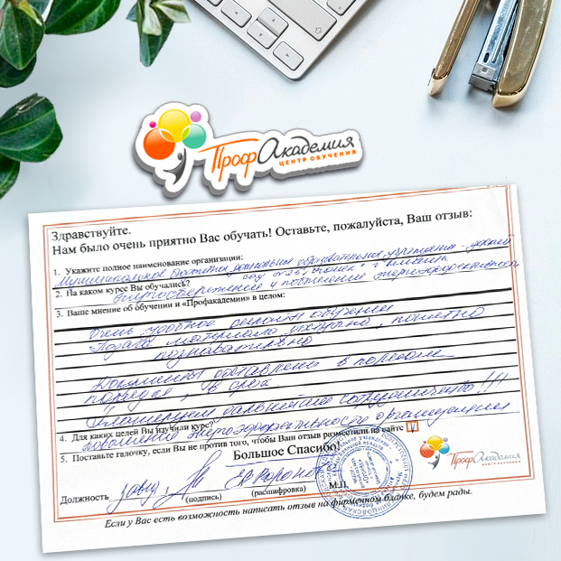 Выражаю благодарность за отлично проведенную работу по повышению квалификации. Можно отметить высокую квалификацию преподавательского состава, четкую и профессиональную работу специалистов "Профакадемии" при организации учебного процесса, а также качество профессиональных знаний. Мы благодарим за высокопрофессиональный подход и качественную подачу материала