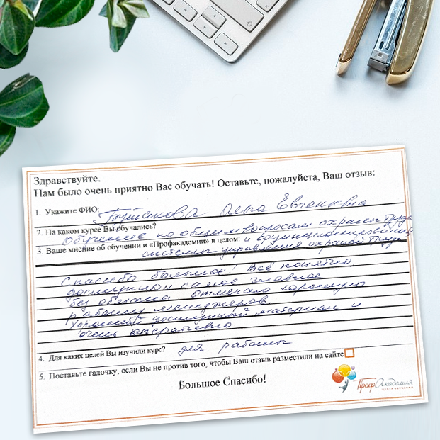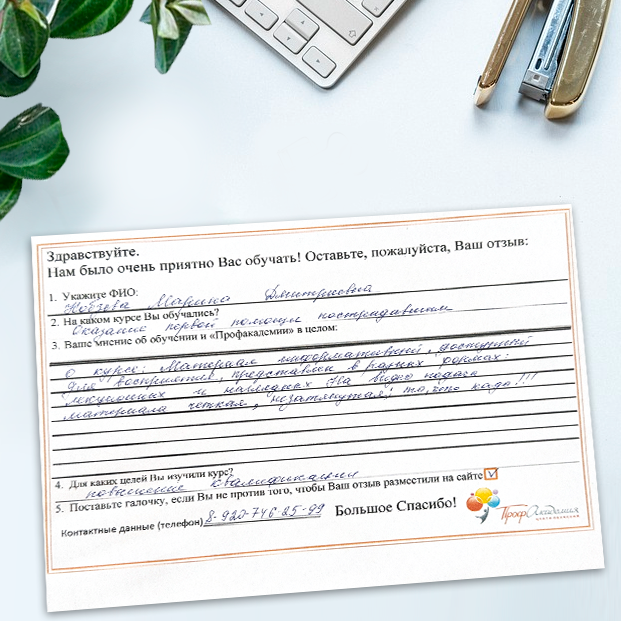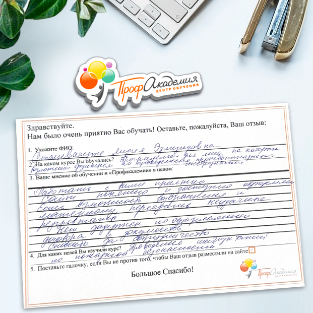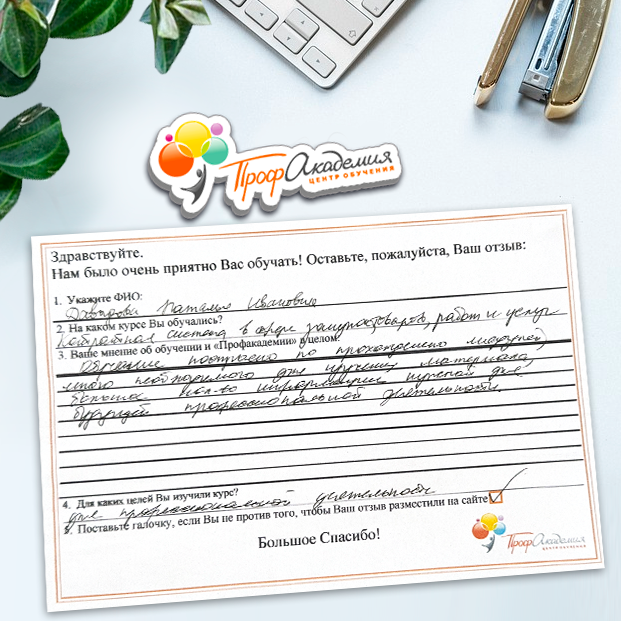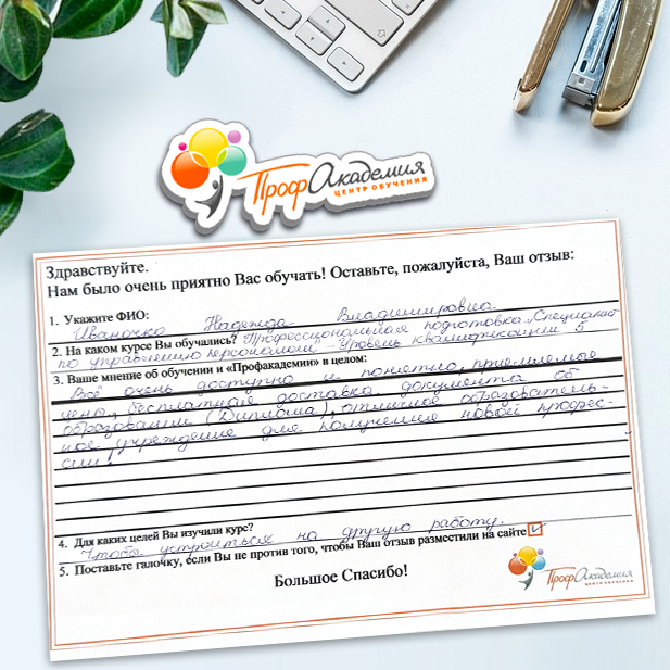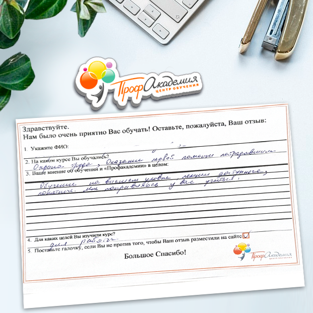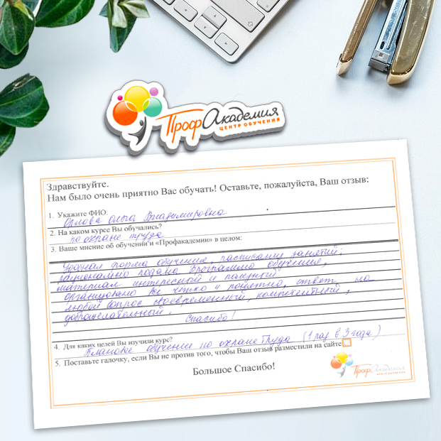 Очень приятно обучаться в "Профакадемии", все очень точно, быстро, внятно. Получила свое удостоверение, спасибо большое.