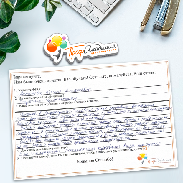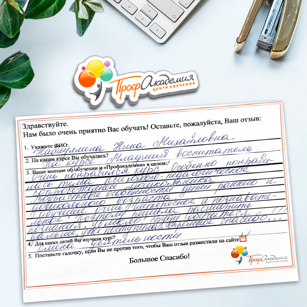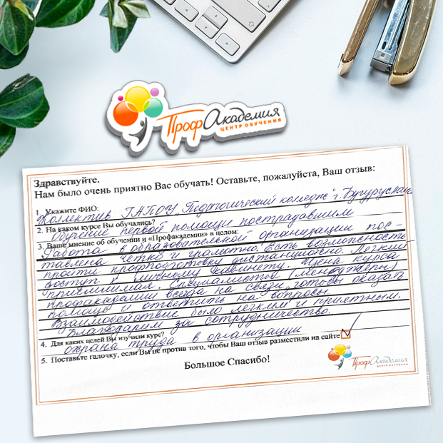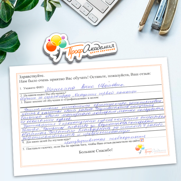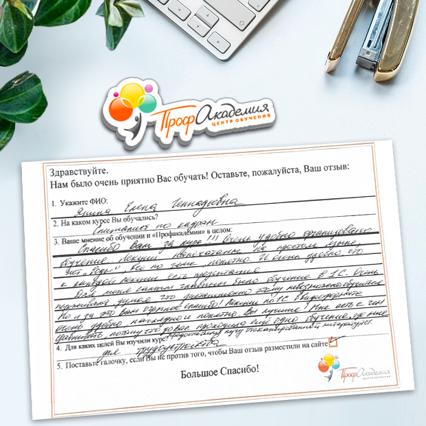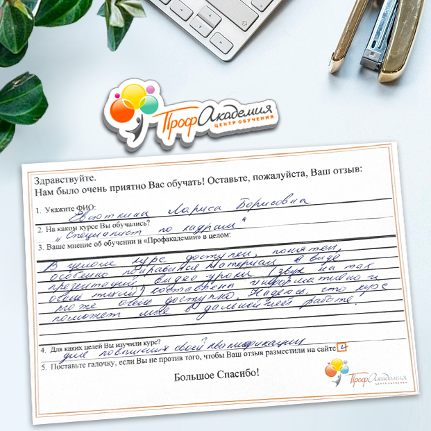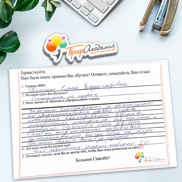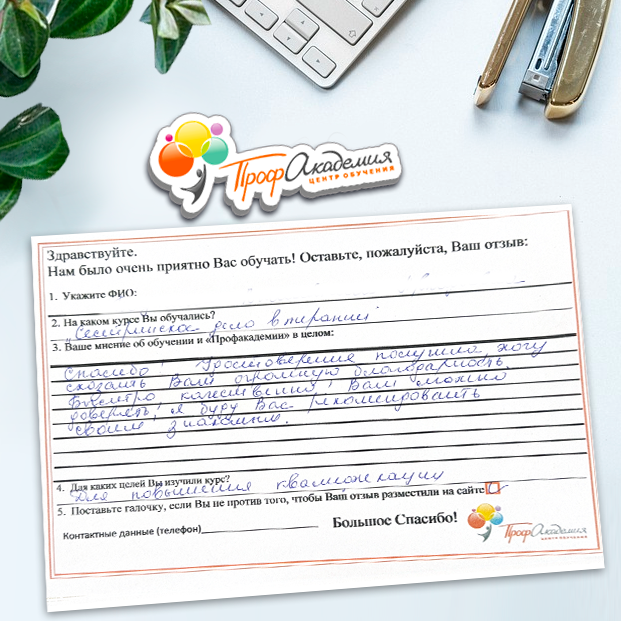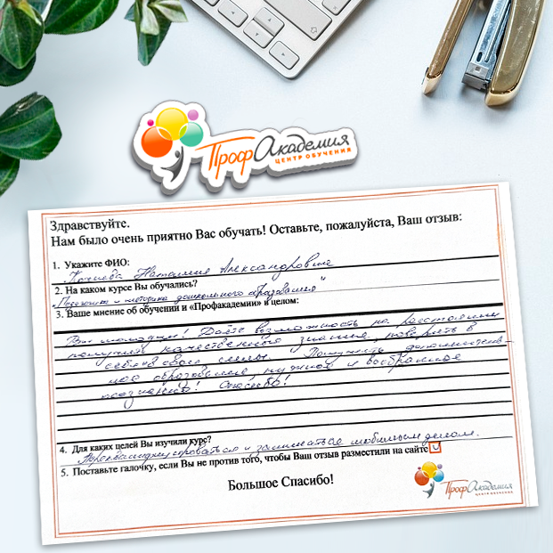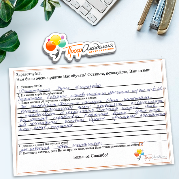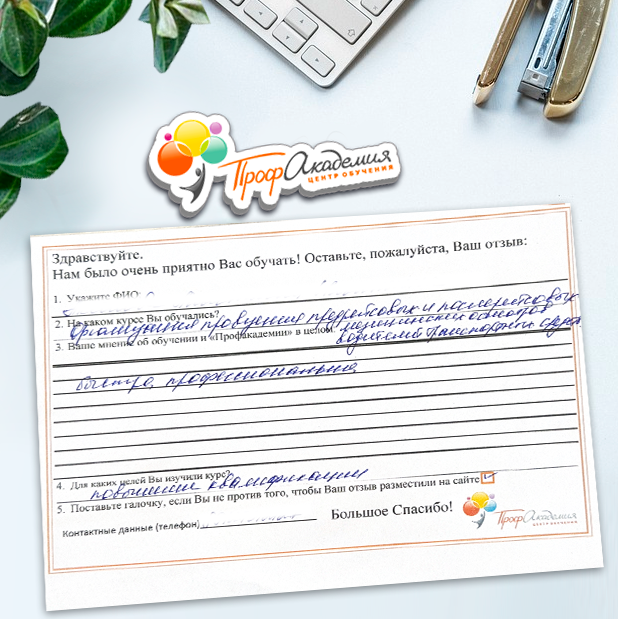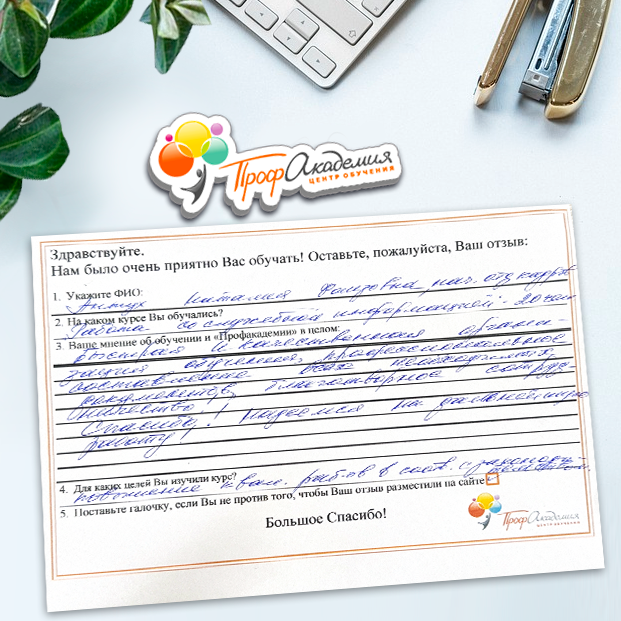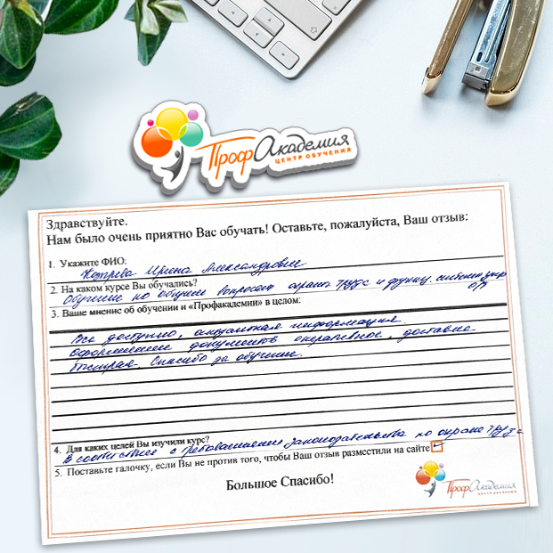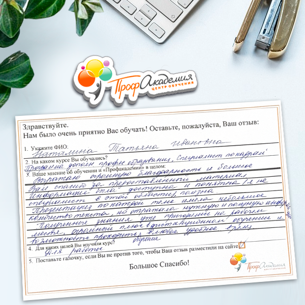 Хочу выразить благодарность, сказать большое спасибо особенно Синица Татьяне и команде "Профессиональная академия" за ваш труд, отзывчивость и оперативность. Я проходила обучение по нескольким курсам и всегда сотрудники были на связи, всегда разъясняли интересующие вопросы, всегда доброжелательные. Приемлемые цены, отличная работа специалиста, как я уже упоминала ранее Татьяна Синица, которая четкое знает свое дело. В общем одни плюсы и никакой головной боли!