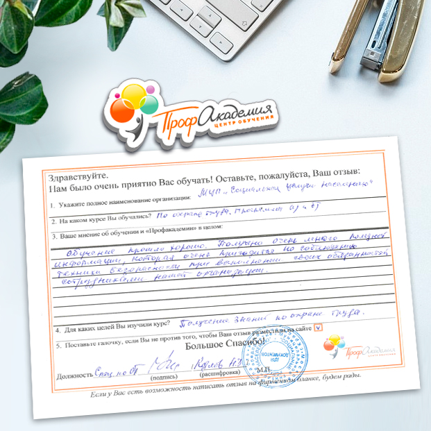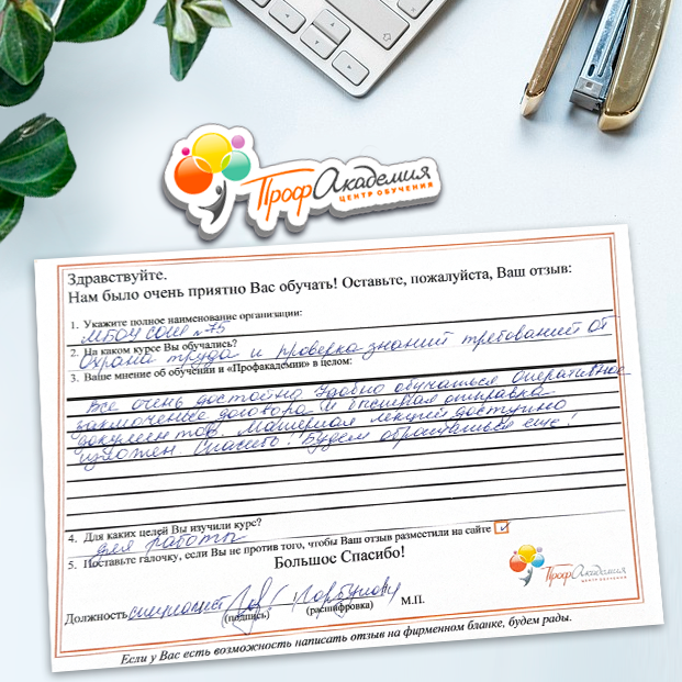 Курсы переподготовки понравились. Много нового в законодательстве по охране труда изучили. Применяли уже в учреждении на практике. Спасибо большое и в дальнейшем будем с ООО "Профакадемия" работать по обучению. Всех с новым годом! Здоровья, мира и терпения.