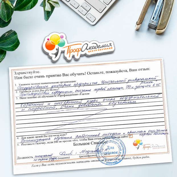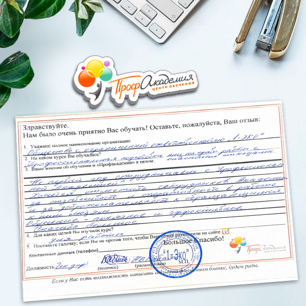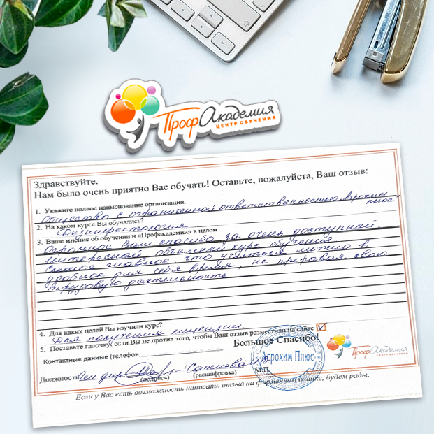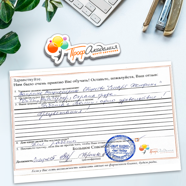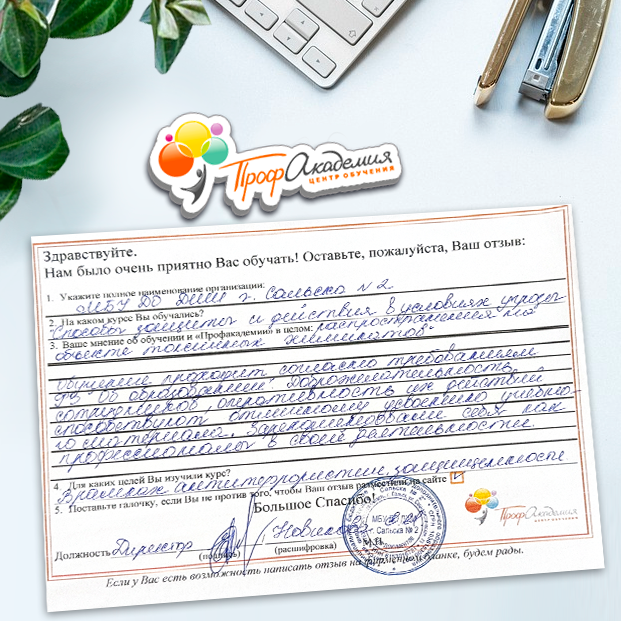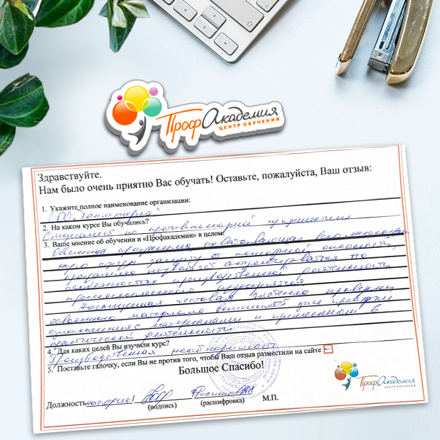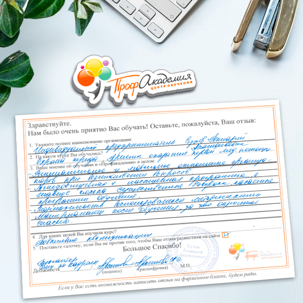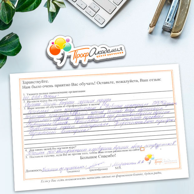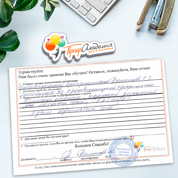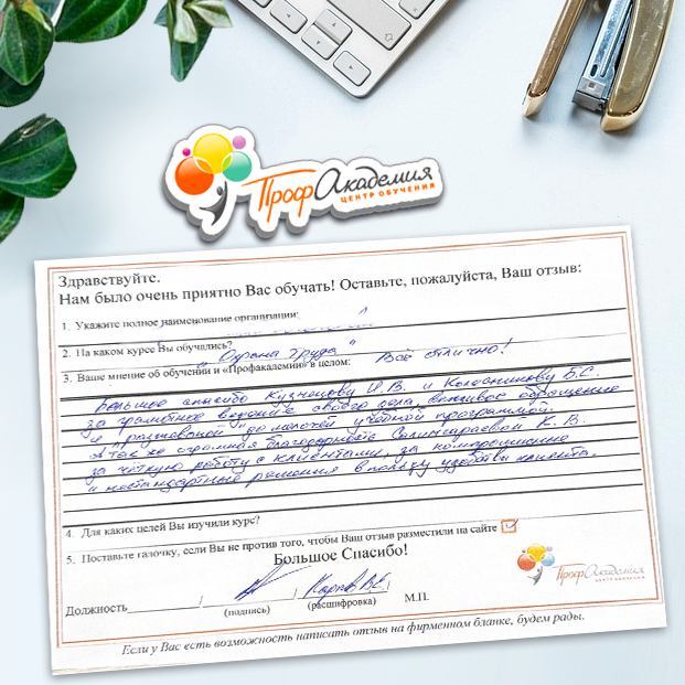 Спасибо Профакадемии за доступное обучение, наши сотрудники с легкостью прошли все курсы, информация в виде презентаций изложена очень четко, лаконично и быстро усваиваться. Мы уже стали Вашими постоянными учениками, будем и дальше взаимодействовать. С вами приятно работать