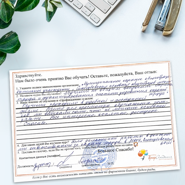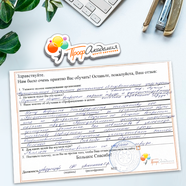 Обучение прошло не отрываясь от рабочего места и во время рабочего дня. Много себе в работу взяли материала по программе, который необходим для нашей организации; обучение позволило сэкономить время, нервы руководителя, скачать плакаты и получить документы об обучении государственного образца.