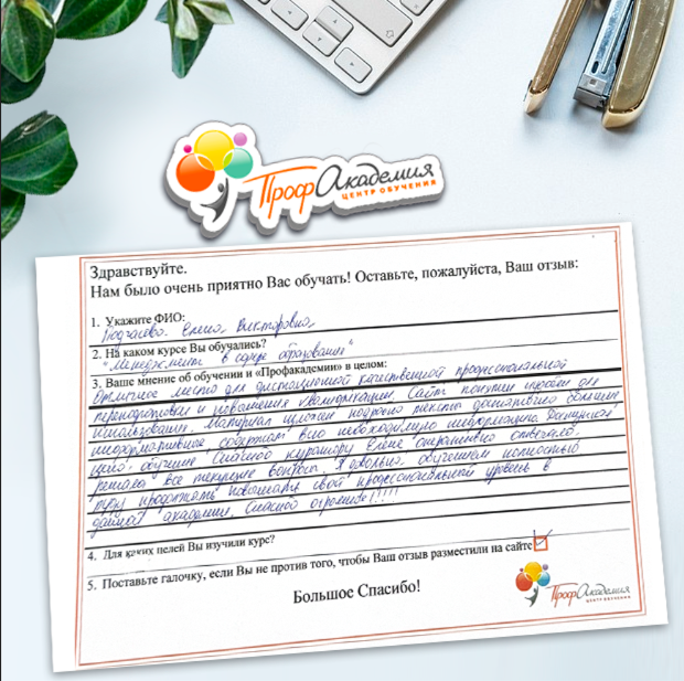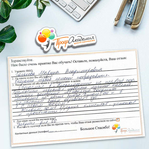 Хочу выразить огромную благодарность всей группе Профакадемии. Понравилось все. Вся информация об обучении находится в доступной форме. Очень боялась когда нашла обучение, но все оказалось намного проще. Надеюсь все что изучила за время обучения станет замечательным фундаментом для моей новой жизни.