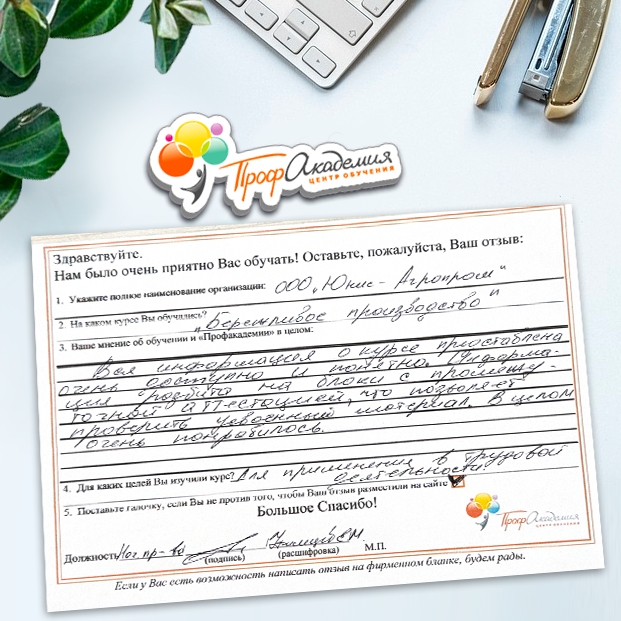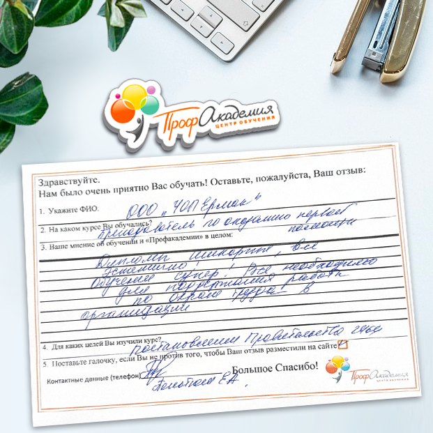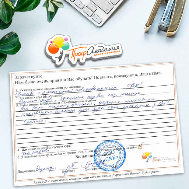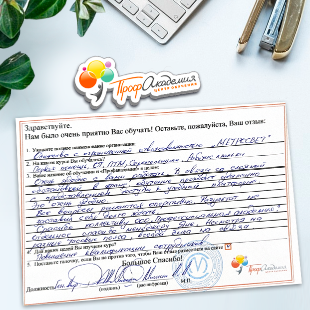 Наши сотрудники неоднократно проходили обучение в Вашей академии и с огромным удовольствием вернемся к Вам снова. Все доступно, понятно и отлично! Большое спасибо!
