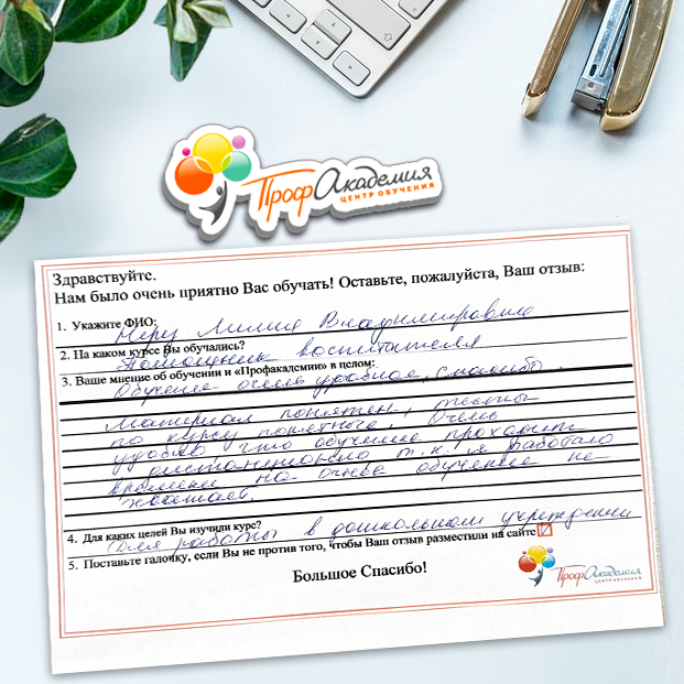 Слаженная работа администрации и преподавателей. Очень понятный и интересный курс. Очень полезный не только в работе, но и в жизни. Спасибо большое за оперативную отправку документов и за ваш труд.